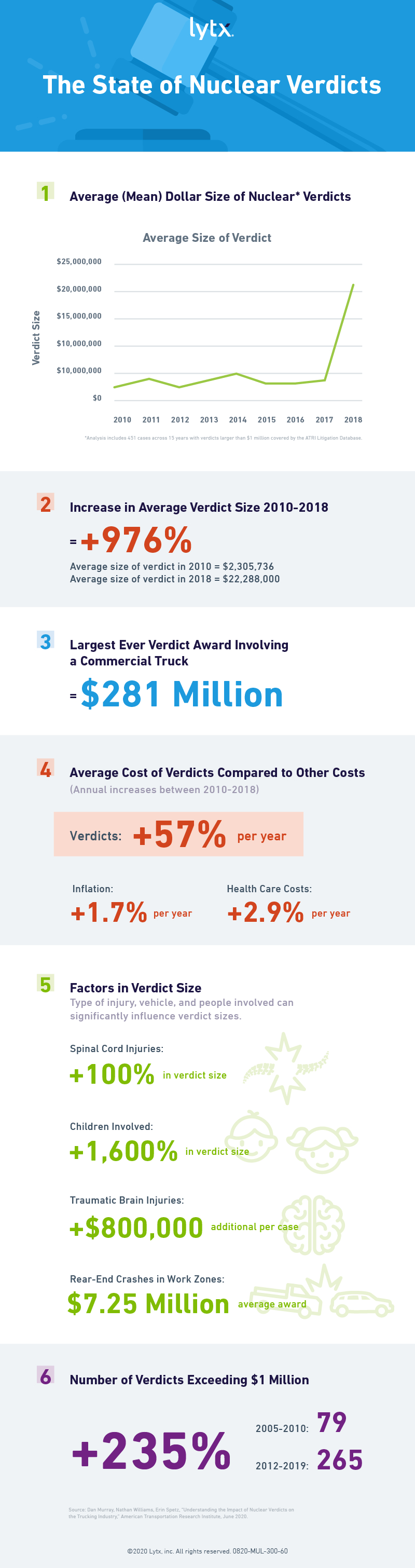 Nuclear verdicts have grown both in number and in size over the past 15 years, according to the analysis, which examined 451 cases with verdicts larger than $1 million listed in the ATRI Litigation Database.