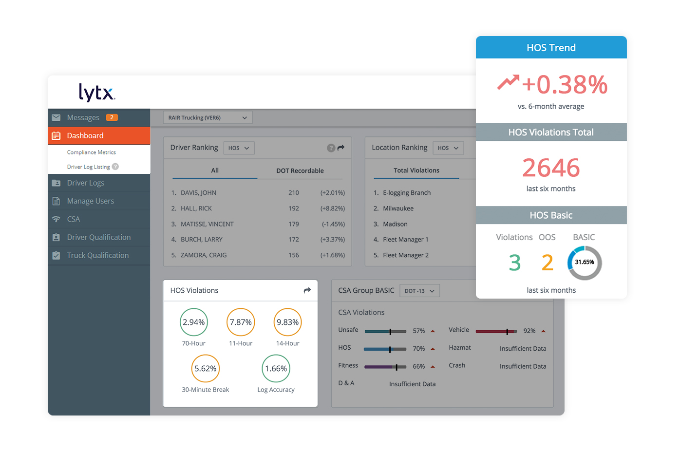 Whether your company uses electronic logging devices (ELDs), paper logs, time sheets, or all three to manage hours of service rules, we’ve got you covered. The Lytx Compliance Services solution (formerly known as RAIR) hours of service (HOS) tracking system audits all driver logs and supporting documents, regardless of format, to help you ensure compliance under the ELD mandate. We compile your datasets, providing a single, online source of truth to help track driver HOS compliance.