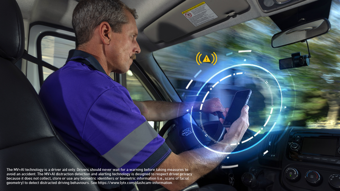 *Lytx MV+AI Technology is a driver aid only. Drivers should never wait for a warning before taking measures to avoid an accident. Lytx MV+AI distraction detection and alerting technology is designed to respect driver privacy because it does not collect, store or use any biometric identifiers or biometric information (i.e., scans of facial geometry) to detect distracted driving behaviors. See www.lytx.com/en-us/driver-information.
