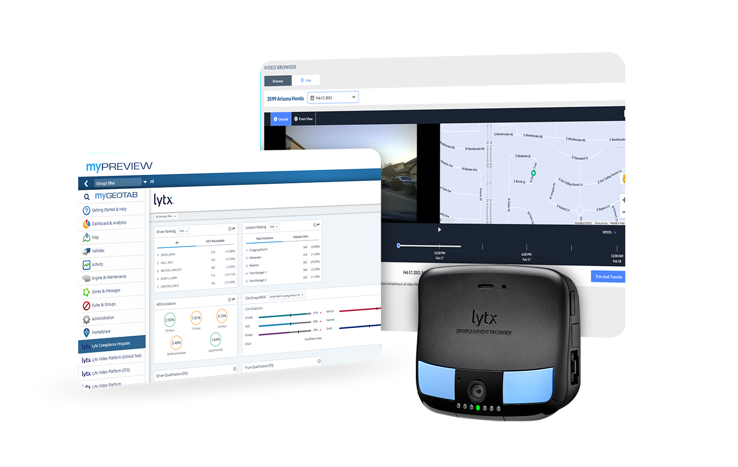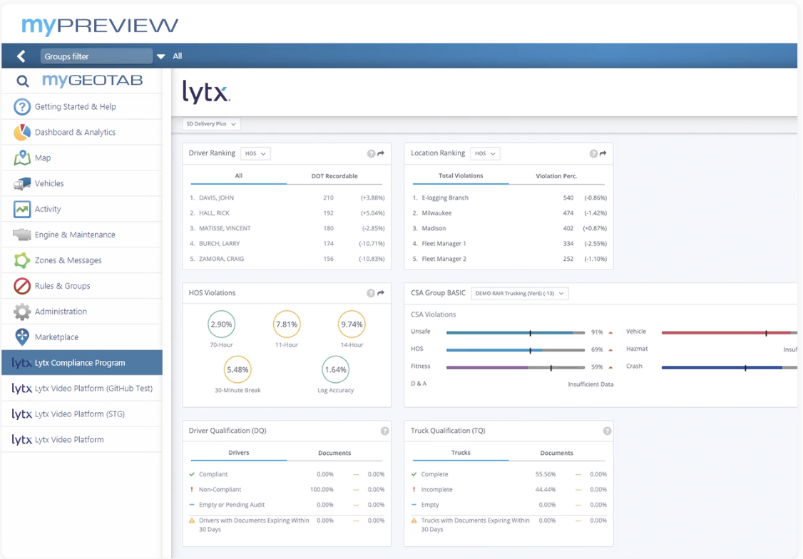 Geotab® and Lytx® have joined to offer you intelligent video, advanced telematics, and DOT compliance solutions – all in one integrated, easy-to-use platform. Now you can combine the power of Lytx video and Department of Transportation (DOT) compliance within the Geotab platform for a consolidated view of your fleet.