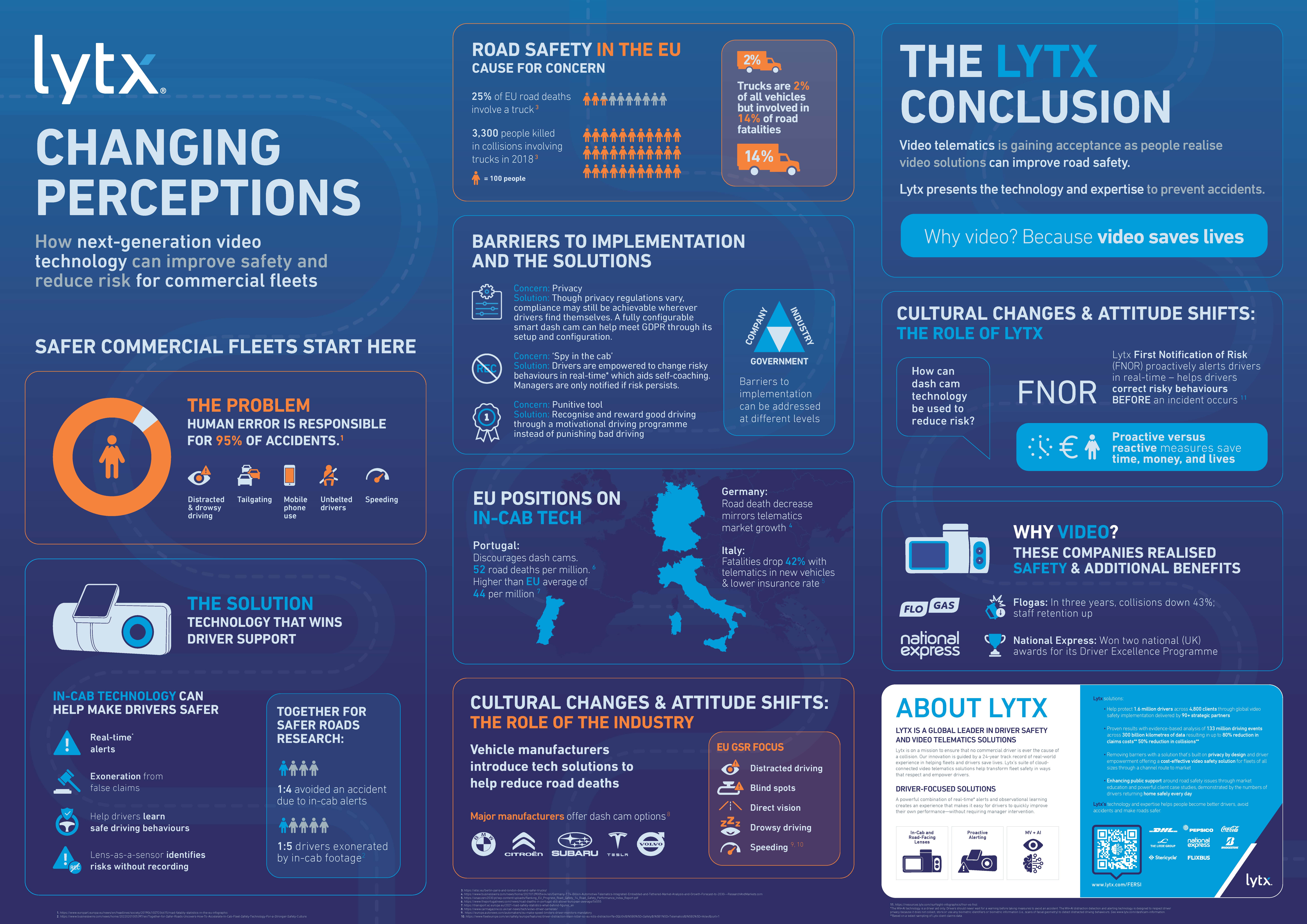 Lytx is on a mission to ensure that no commercial driver is ever the cause of a collision. However, in 2017 alone, there were 25,000 road deaths in Europe,1 with the EU estimating that human error is to blame for 95% of accidents2 . We believe we can change those statistics through intelligent, in-cab technology that empowers drivers to recognise and reduce their own risky behaviours.